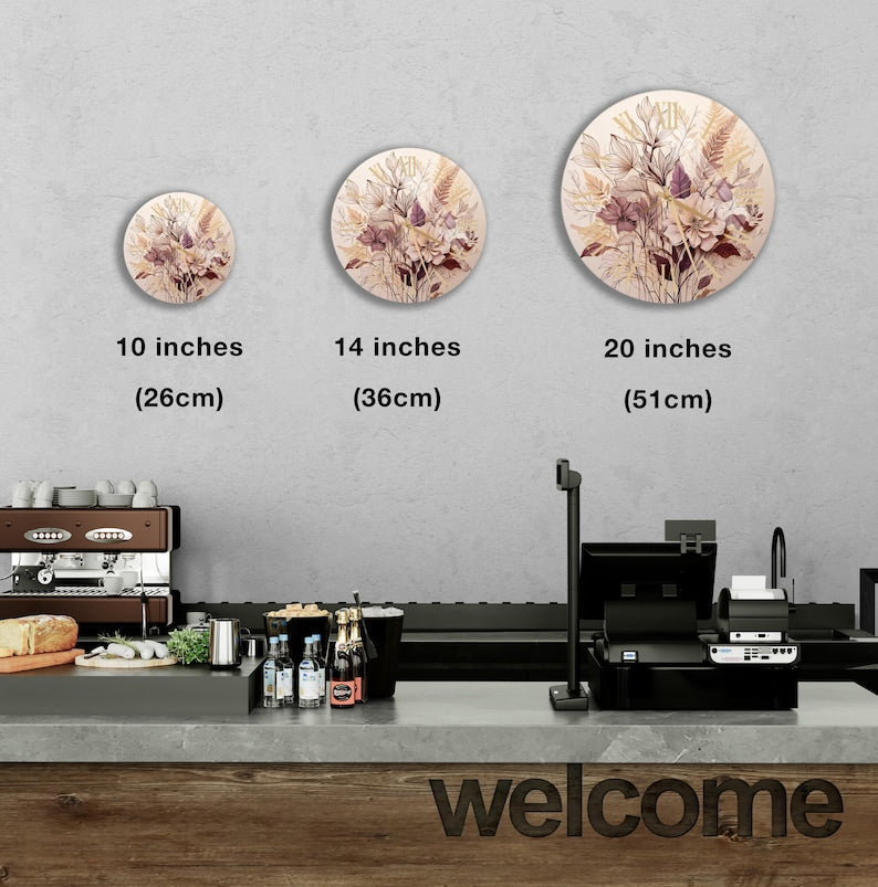 Avec ses délicats motifs floraux beiges et violets sur du verre trempé, cette horloge murale ajoute une élégance calme et naturelle à tout intérieur de maison moderne ou confortable.