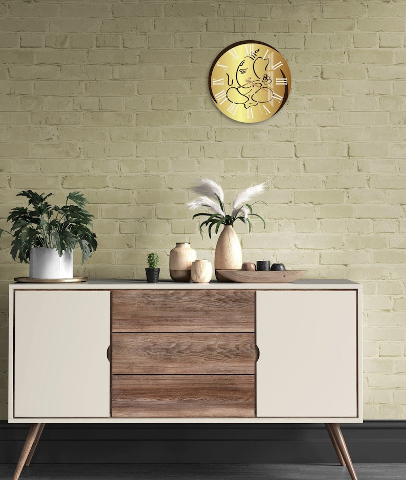 Ganesh doré en art hindou avec horloge murale en verre pour le salon