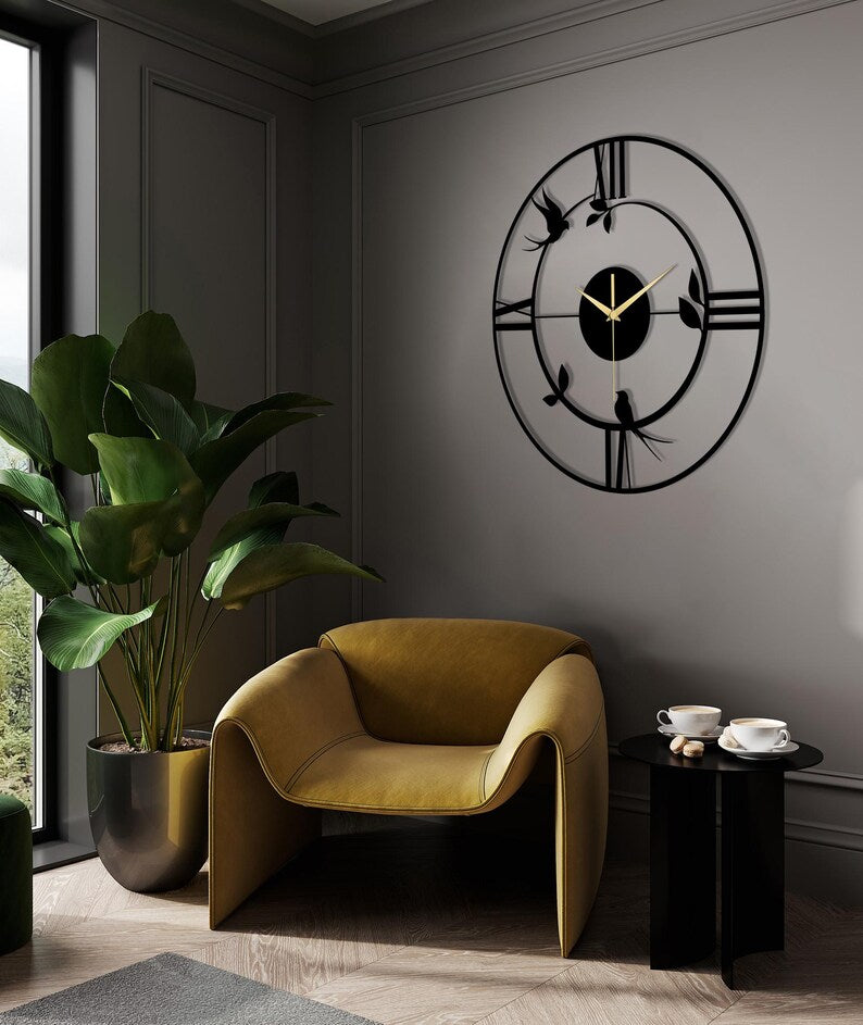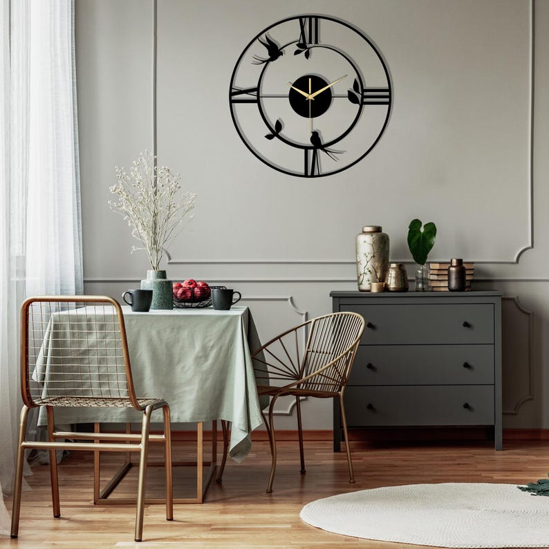 Cette magnifique horloge murale en métal, ornée de chiffres romains et d'un motif d'oiseau en vol, est l'accessoire idéal pour votre décoration intérieure.