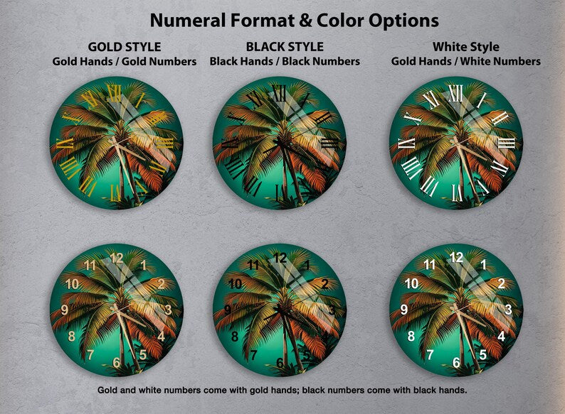 Horloge murale en verre trempé avec motif de palmier tropical vibrant