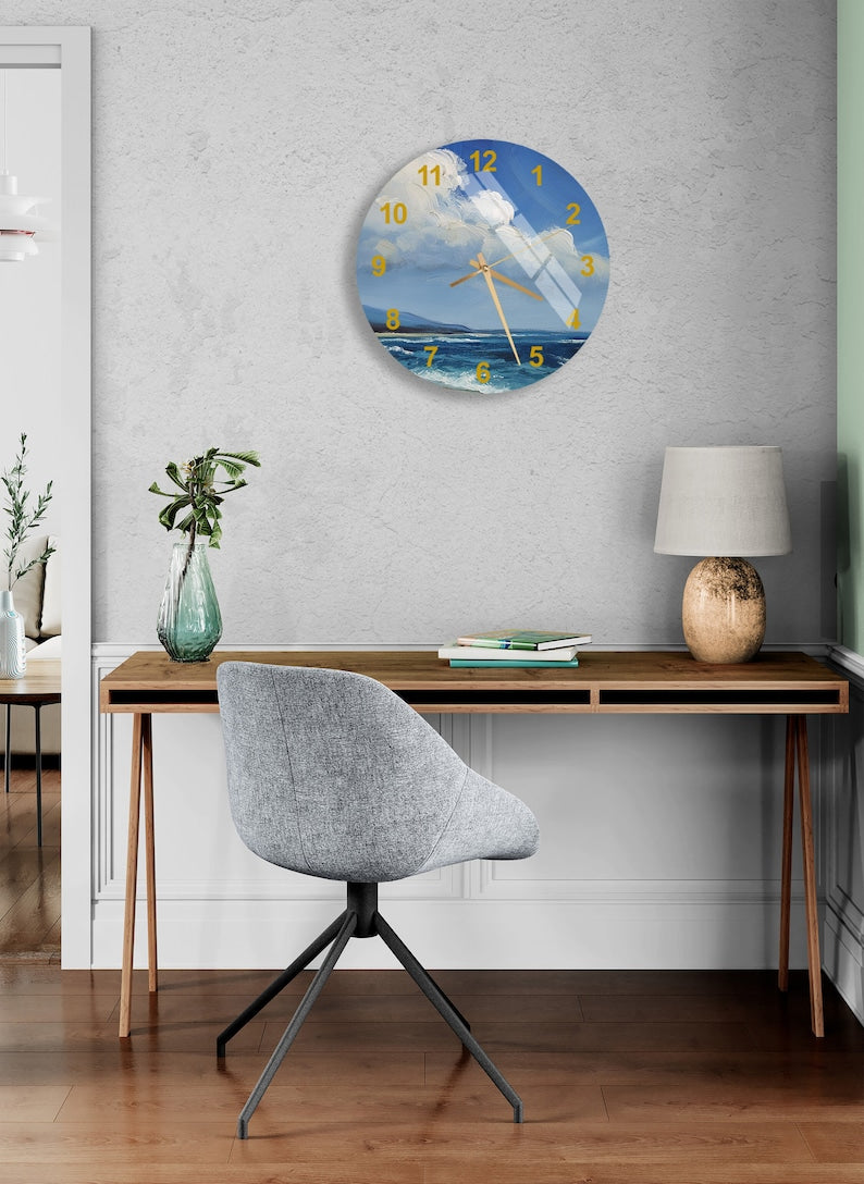 Horloge murale en verre trempé avec vue sur le ciel bleu, les nuages blancs et la mer