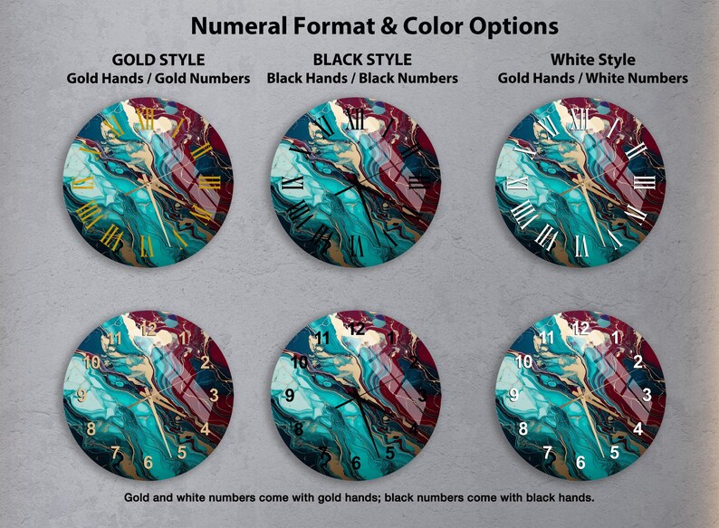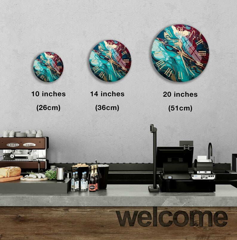 Élevez votre espace avec cette horloge murale luxueuse à chiffres romains, représentant des oeuvres d'art en marbre bleu sarcelle et bordeaux avec des accents dorés sur du verre trempé. Son mouvement de balayage silencieux et son design audacieux en font une pièce de décoration remarquable pour les intérieurs modernes et élégants.