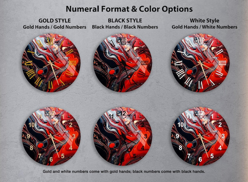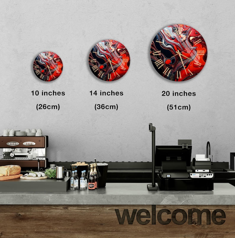 Montez le drame avec cette horloge murale abstraite rouge et noire, représentant des oeuvres d'art fluides audacieuses imprimées sur du verre trempé. Avec son mécanisme silencieux et son design saisissant, c'est une pièce maîtresse moderne pour les cuisines, les bureaux ou les espaces de vie créatifs.